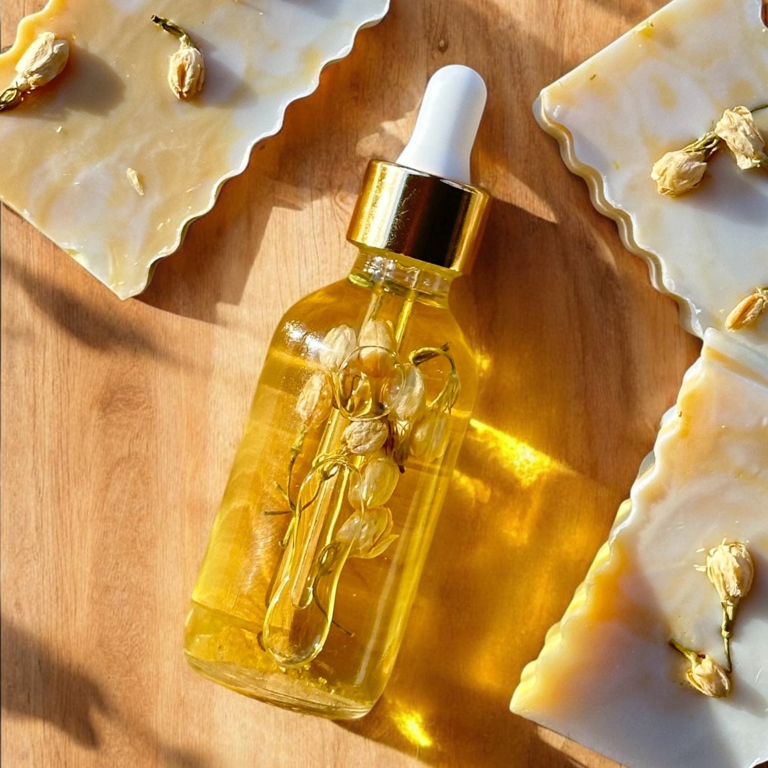 A lovingly created oil made from the blooms of Zinnias we grow right at home. Handcrafted and sun infused to protect, soothe, hydrate + enhance the skin, naturally.