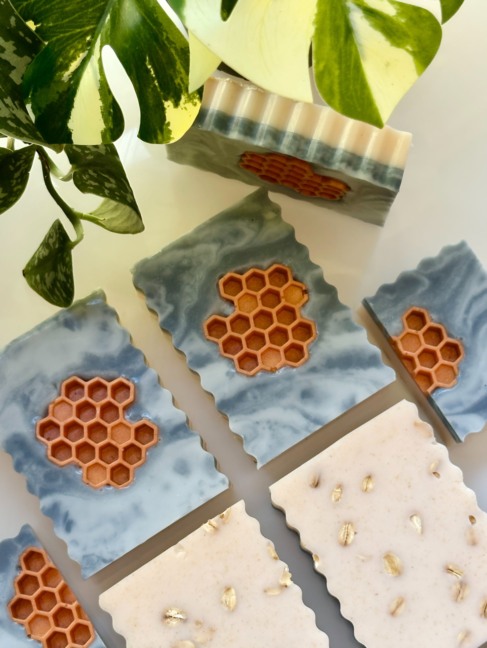 Blueberry Honey Crumble is another delicious (but not edible) rendition of our viral oats & honey soaps. This soap is crafted with organic oatmeal, Manuka honey, Serbian blue clay, indigo powder and our homegrown chamomile infused oil. It is scented with a combination of natural and phthalate free fragrances and essential oils with notes of blueberry jam, apple, cinnamon, vanilla, lemon and cloves. It is bright, citrusy, almost candy-like and has warm + spicy undertones.