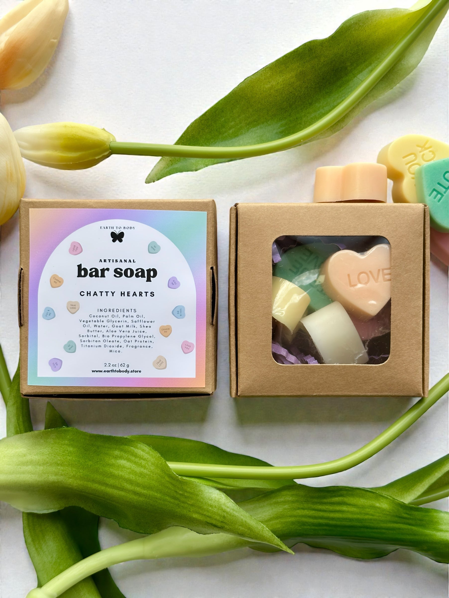 This year’s Valentine’s Day mini gift box set is inspired by the classic conversation heart candies! These sets contain 6 mini hand soaps—each in the classic sweetheart colors. They are scented with a custom fragrance blend that smells candy-like and delicious—but please don’t eat them! Each heart is colored with mica powder.